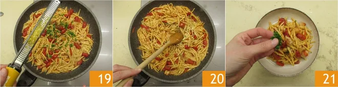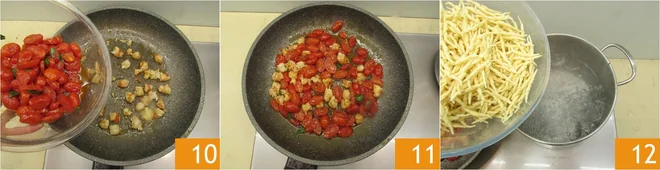 Now add the cherry tomatoes 10, toss everything together 11, and turn off the heat. Keep it warm and cook the trofie in the now boiling water 12.