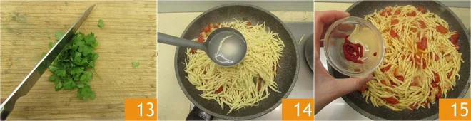 Chop the parsley 13, and when the trofie are cooked, drain them, keeping aside some cooking water. Transfer them to the pan with the cherry tomatoes and shrimp, add a ladle of cooking water 14, and toss briefly. Add the tomato paste 15 and toss again.