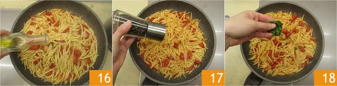 Now, with the heat off, stir with a drizzle of oil 16; add a grind of black pepper 17 and some of the chopped parsley 18.