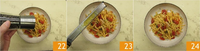 Add another grind of pepper 22, some more grated lemon zest 23, and serve your pasta with cherry tomatoes and shrimp 34!