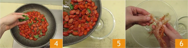 Increase the heat and cook the cherry tomatoes for a few minutes until they release some juice. Remove the garlic and chili pepper, then add the basil leaves, tearing them by hand 4, a pinch of salt, and transfer the tomatoes to a bowl 5. Set them aside, and in the meantime, bring the water to a boil for cooking the pasta and lightly salt it. Then clean the shrimp by removing the shell 6 and the internal filament.