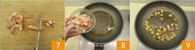 Cut the shrimp into 1-2 cm (about 1/2-3/4 inch) pieces 7. In the same pan where you cooked the cherry tomatoes, pour another drizzle of oil and let it heat. Add the shrimp 8 and sauté for a few minutes until they are golden brown 9.