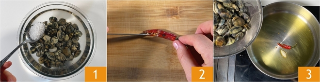 To make pasta with clams and broccoli, first select the clams to remove any broken ones, then transfer them to a bowl with cold water and coarse salt 1. Soak them for a couple of hours, changing the water occasionally to purge sand and impurities. After this time, drain and rinse the clams, then tap each one on the work surface to check for sand inside. Now you are ready to proceed with the recipe: cut a chili pepper lengthwise 2 and place it in a pan with a drizzle of oil and a garlic clove. Once the base is hot, add the clams 3.