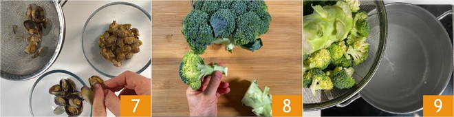 Shell most of the clams, keeping a few aside for decoration 7. Move on to the broccoli: cut the stem and divide it into very small florets 8, then rinse thoroughly. Bring a pot of slightly salted water to a boil and cook both the stem and florets for 10-15 minutes 9.