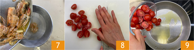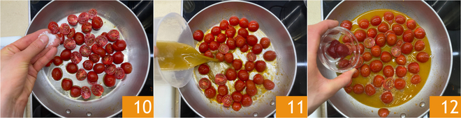 When the alcohol has evaporated, strain the cooking base through a fine-mesh sieve 7. Cut the cherry tomatoes in half 8 and add them to the same pan with a drizzle of oil 9.