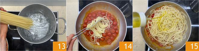 Meanwhile, cook the pasta in plenty of salted water 13. Drain it al dente directly into the pan 14, then add a ladle of cooking water and a drizzle of oil 15.