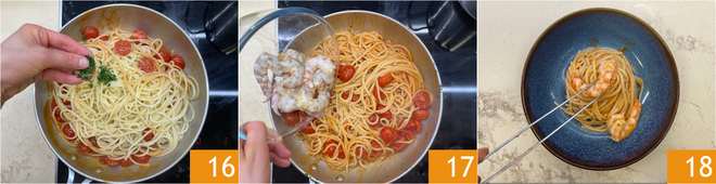Flavor with chopped parsley 16 and mix well. Finally, add the shelled prawns 17 and continue cooking for another couple of minutes. Plate the spaghetti with prawns 18.