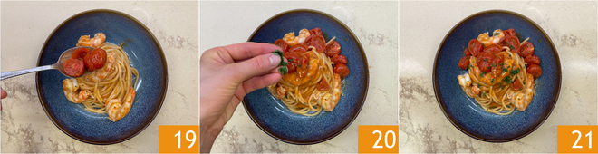 Add more sauce 19 and chopped parsley to taste 20. Your pasta with prawns is ready to be served 21!