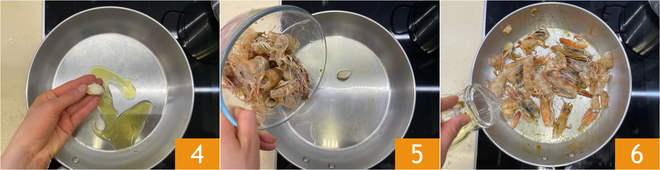 In a pan, flavor some oil with garlic for a few minutes 4, then add the prawn heads and shells 5. Sauté well, then deglaze with white wine 6.