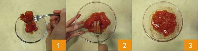 To make penne all’arrabbiata, start by draining the peeled tomatoes. Transfer them to a bowl 1 and crush them with a fork 2 to break them up 3.