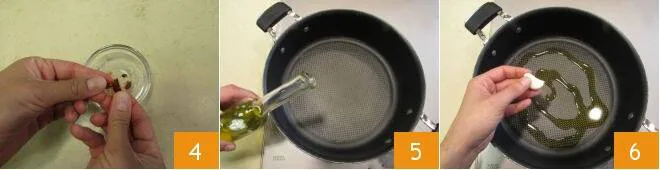 Next, crumble the dried chili 4. Place a pot full of water, salted to taste, on the stove to cook the pasta. Meanwhile, pour a drizzle of oil 5 into a pan and add the peeled garlic clove 6.