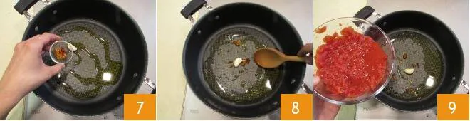 Now add the chili 7 and fry it lightly over low heat 8, then add the tomatoes 9.