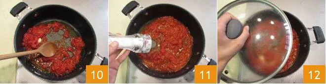 Stir 10 it and add salt to taste 11. Cover the pan with a lid 12 and let this sauce cook for around 12 minutes, stirring every so often.
