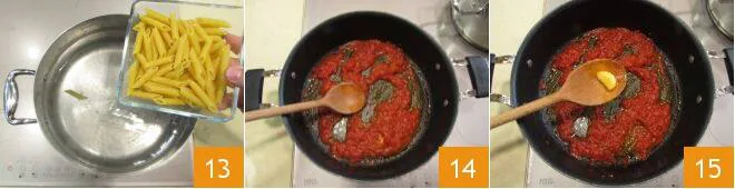 When the sauce is nearly ready, put the pasta on to cook as well. Cook it al dente, following the cooking times stated on the packaging 13. Once 12 minutes have passed, take the lid off the pan 14 and remove the garlic 15.