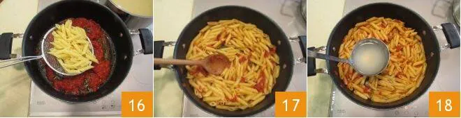 Drain the pasta and pour it directly into the sauce 16. Heat through for a minute 17, adding some of the cooking water if necessary 18, then turn off the heat.