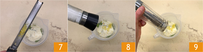 Grate the zest of half a lemon 7, add salt 8 and pepper 9.