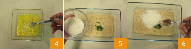 Now beat the eggs in a bowl with salt and pepper 4. Place the breadcrumbs in a baking tray, add the finely chopped rosemary, the parmigiano cheese 5 and the powdered peperoncino 6. Stir with a spoon and leave to one side.