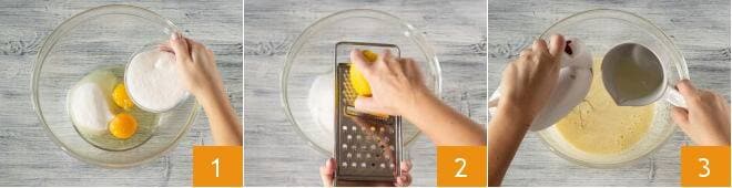 To make the ricotta and lemon muffins, first break the eggs into a large bowl, add the sugar 1 and the lemon zest 2. Whisk the mixture with an electric mixer and gradually add the vegetable oil 3.