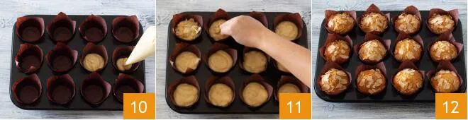Line a 12-muffin tin with paper liners and pipe the batter into the liners until they are two-thirds full 10. Sprinkle with sliced almonds 11 and bake in a preheated static oven at 350°F for 18-20 minutes. Once baked, remove the ricotta and lemon muffins from the oven and let them cool slightly before serving 12.
