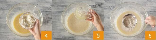 At this point, incorporate the well-drained ricotta 4 and the lemon juice 5. Now add the flour and baking powder, sifting them through a sieve 6.