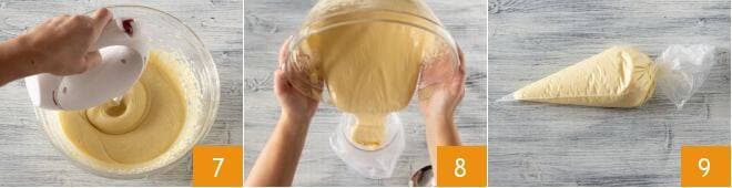 Continue beating with the electric mixer until you have a smooth, lump-free mixture 7. Transfer the batter into a piping bag without a nozzle 8 9.