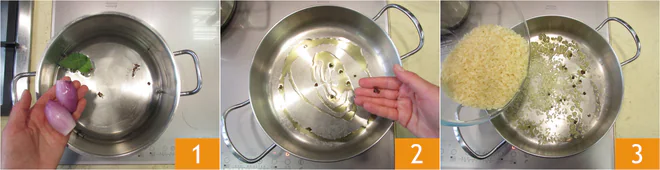 To prepare risotto with figs, start with the broth: fill a large pot with water and season with pepper, the peeled shallot and bay leaves 1. Bring to a boil, then keep warm. In another pan pour a drizzle of extra virgin olive oil 2, a few grains of Sichuan pepper and toast for a couple of minutes. Pour the rice into the pan 3 and toast for about 3 minutes, until hot.
