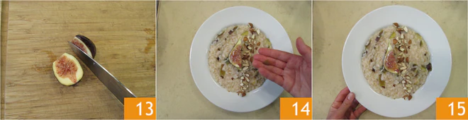 Cut a fig into wedges 13 and serve your risotto with figs garnishing the dishes with almonds 14 and fresh fig 15.