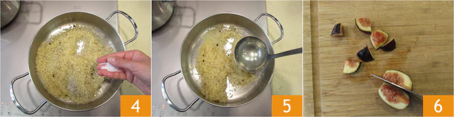 Salt the rice 4 and sprinkle with a couple of ladles of broth. Cook for about 5 minutes over medium heat adding broth as needed 5. In the meantime, peel the figs (without peeling them) and cut them into pieces of about 0.75" (2 cm) 6. Keep one aside to garnish the dishes.