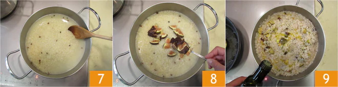 After 5 minutes 7 pour the figs 8 and mix. Bring the rice to cook by adding broth as needed. Turn off the heat and stir in a drizzle of olive oil 9.