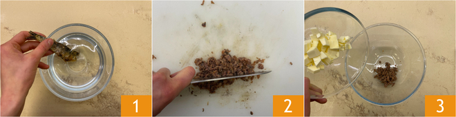 To prepare the Risotto with Radicchio, Anchovy Butter, and Aromatic Breadcrumbs, start with the anchovy cream: after desalting them in water for a few hours, depending on the need 1, chop them finely with a knife 2. Transfer the chopped anchovies to a bowl and add softened butter 3.