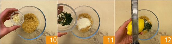Transfer the toasted breadcrumbs to a bowl and let cool, then season with chopped garlic 10, grated Parmigiano Reggiano, chopped celery and parsley leaves 11, and grated lemon zest 12.