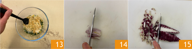 Season with salt and pepper and mix, then set aside 13. Clean and chop the shallot 14. Clean the radicchio by removing the tougher base, then slice it finely 15.
