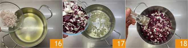 In a saucepan, pour the oil and the shallot 16, sauté over low heat and then add the radicchio 17. Season with salt and pepper 18 and cook for 5 minutes. Transfer the cooked radicchio to a bowl.