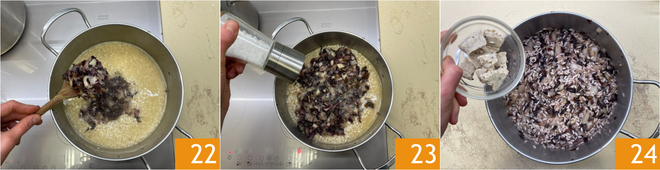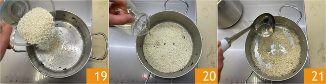 In the same saucepan, toast the rice dry 19. Deglaze with wine 20 and let it evaporate. Cook the rice by adding a ladle of broth at a time, always waiting for the previous one to be absorbed before adding another 21.