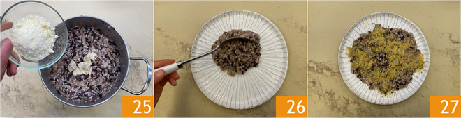 Also add grated Parmigiano Reggiano 25 and stir to achieve a creamy consistency. Plate the risotto 26 and finish with aromatic breadcrumbs and lemon zest. Your risotto with radicchio, anchovy butter, and aromatic bread is ready to be served 27!