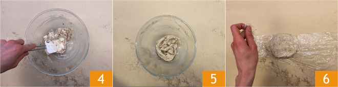 Mix with a spatula 4 to create a creamy mixture 5. Wrap the mixture in plastic wrap 6 and place it in the refrigerator for about 30 minutes.