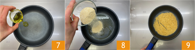 In a pan, heat the oil 7, then add the breadcrumbs 8 and toast until golden 9.