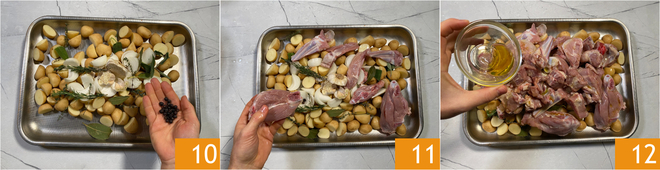 Add the juniper berries 10 and, finally, the drained lamb pieces 11. Season with salt, pepper and oil 12.
