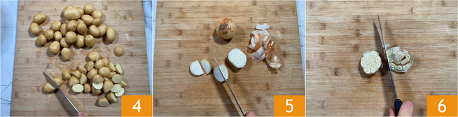 Wash and dry the potatoes, then cut them in half 4. Trim and cut the onion into wedges 5. Finally, cut the head of garlic in half 6.