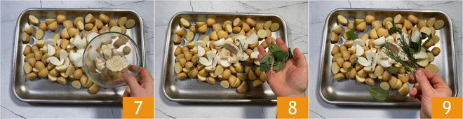 Arrange the potatoes, onion and garlic in a roasting pan 7, then season with thyme and torn sage leaves 8, bay leaf and rosemary 9.