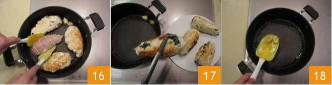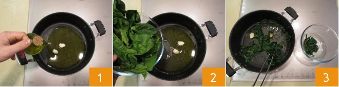 To prepare ricotta and spinach stuffed chicken breast, start by cooking the meat. Rinse the chicken pieces and heat the oil in a capacious pan, with two peeled garlic cloves 1. Add the spinach and saute for a few minutes, with a pinch of salt 2. Remove from the heat as soon as it softens, then gather with a fork or cooking tongs 3.