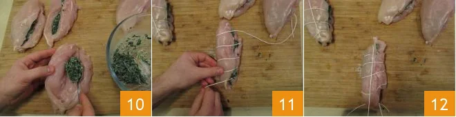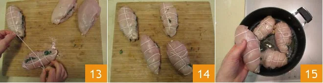 Use a teaspoon to fill the pockets 10. Now wrap the pockets with cooking twine, or you can use a couple of toothpicks for each piece 11. Be sure to fasten the cooking twine vertically as well, otherwise the meat pieces will open up during cooking 12.