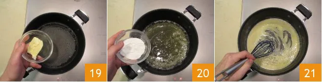 Melt the butter on a lower flame in the same pan 19, then add the flour all in one go 20 and make the roux by stirring with a whisk, just like for bechamel 21.