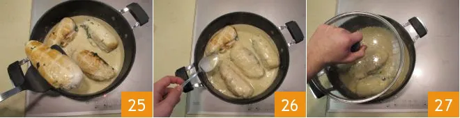 and place the chicken breasts in the sauce 25. Add salt and pepper to taste, drizzle the cream over them 26, put the lid on and cook for another 4-5 minutes 27.