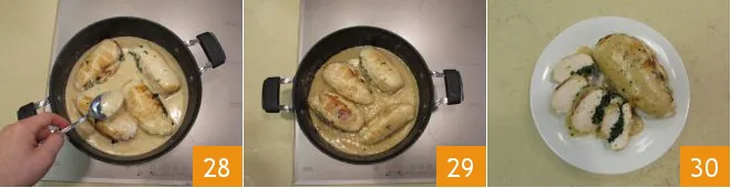 The chicken will finish cooking and the sauce will thicken; drizzle it over the pockets once more 28 and your ricotta and spinach stuffed chicken breast are ready 29: all you need to do is enjoy them while they're nice and hot 30!