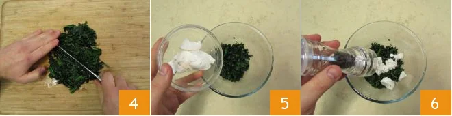 Finely chop it on a cutting board using a knife 4 and place in a bowl; add the ricotta cheese 5 and a pinch of black pepper 6.