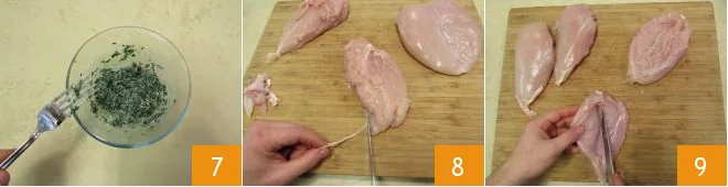 Stir and leave to one side 7. Cut the chicken in half, remove any bones in the top part of the cut and the cartilage on the bottom. In this way you will have 4 pieces 8. Now use a smooth bladed knife to cut a pocket in the meat, but be sure not to cut all the way to the bottom 9, otherwise the filling will leak out. Do the same with all the other pieces.
