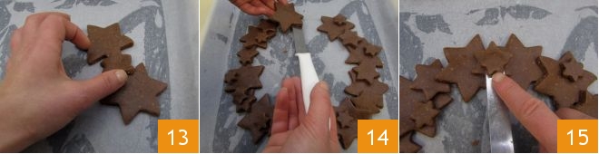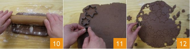 After the necessary time, take the shortcrust dough and roll it out to a thickness of 0.4 inches on a lightly floured work surface 10. Then cut out with large, medium, and small star-shaped cutters (11-12). You can quickly re-knead the shortcrust and continue until the dough is used up.