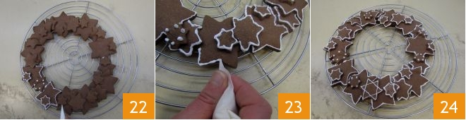 Once they are completely cold, decorate the stars by outlining the border (22-23) or creating the decorations you prefer for your star centerpiece 34!