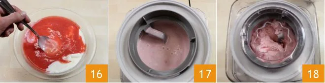 Once ready 19, transfer the ice cream from the ice cream maker to a bowl 20 and let it firm in the freezer for at least 4 hours, or better yet, overnight. When serving, you can choose to present the strawberry ice cream in cute cups 21 and garnish with wafers. If you have time, you can also prepare cat's tongue cookies, for which you can find the recipe here!